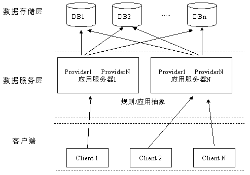 在大規(guī)模系統(tǒng)中,為保證數(shù)據(jù)庫訪問的效率和安全性,數(shù)據(jù)訪問方式一般采用由Client、中間層應(yīng)用服務(wù)器(或叫規(guī)則服務(wù)器)和Server組成的三層Client/Server結(jié)構(gòu)。將數(shù)據(jù)庫應(yīng)用劃分為邏輯上的三個層次,客戶程序只關(guān)心數(shù)據(jù)的顯示與用戶界面;應(yīng)用服務(wù)器處理客戶數(shù)據(jù)查詢與更新請求,可在應(yīng)用服務(wù)器上定義數(shù)據(jù)操作規(guī)則以保證數(shù)據(jù)操作的合法性、安全性與有效性。在三層結(jié)構(gòu)下,方便了軟件的修改和模塊的疊加,客戶端通過應(yīng)用服務(wù)器訪問數(shù)據(jù)庫服務(wù)器,客戶端并不直接與數(shù)據(jù)庫服務(wù)器建立連接,從而減輕了數(shù)據(jù)庫服務(wù)器的壓力,提高整個應(yīng)用系統(tǒng)的運(yùn)行效率。