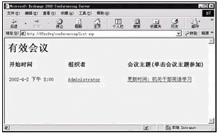 如果在前面已設(shè)置了提醒功能,那么在臨近會(huì)議前屏幕上將出現(xiàn)提醒窗口。教師機(jī)和學(xué)生機(jī)有三種方法可以參加會(huì)議:點(diǎn)擊提醒窗口中[參加會(huì)議]按鈕;或者不等提醒,直接點(diǎn)擊會(huì)議邀請函中的鏈接打開會(huì)議網(wǎng)頁;最好的方式還是打開IE,輸入網(wǎng)址http://x/conferencing/list.asp進(jìn)入會(huì)議(x為Exchange服務(wù)器的IP地址或計(jì)算機(jī)名),如圖3。