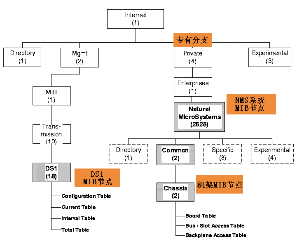 下圖給出了NMS系統(tǒng)中SNMP可訪問網(wǎng)絡(luò)設(shè)備的對(duì)象識(shí)別樹(OID:Object Identifier)結(jié)構(gòu)。