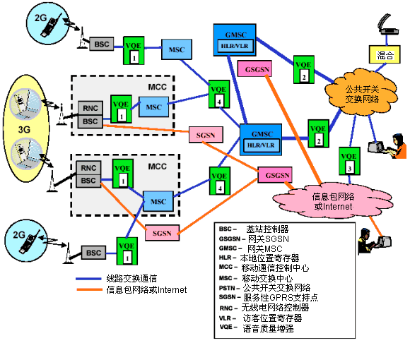 在圖5中,按照VQE和EEC設備的位置,描繪出了3G的網絡拓撲。這是一種綜合性的視圖,融合了2G和3G的核心部分。作為該體系結構中的兩個主要標準組件,BSC和MSC將在相當長的時間內共存。3G