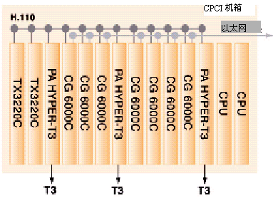 HYPER-T3接入適配板,它用于通過(guò)T3線(xiàn)上的1344個(gè)端口從PSTN接入語(yǔ)音和傳真媒體。這些媒體會(huì)從DS3轉(zhuǎn)換到DS0,然后通過(guò)H.110總線(xiàn)發(fā)送給6塊CG6000C中的一塊。CG6000C會(huì)壓縮這些語(yǔ)音和傳真媒體,然后用UDP/IP上實(shí)時(shí)協(xié)議(RTP)對(duì)它們進(jìn)行打包。再通過(guò)板上的兩個(gè)以太網(wǎng)接口發(fā)送到一個(gè)語(yǔ)音級(jí)的IP包網(wǎng)絡(luò)上。請(qǐng)注意,每種板都使用了N+1板卡級(jí)的冗余備份。