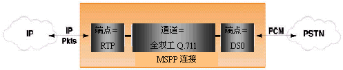 MSPP通道可以是全雙工語(yǔ)音編碼器、傳真轉(zhuǎn)發(fā)編碼器、或者是各種單工通道。在一個(gè)普通VoIP網(wǎng)關(guān)應(yīng)用中,一個(gè)端點(diǎn)就是一個(gè)和PSTN連接的DS0,PSTN連接最常見(jiàn)的是CG6000系列平臺(tái)上的T1或E1接口,也可能是T3接口。其它連接是一個(gè)通過(guò)以太網(wǎng)接口連接到廣域包網(wǎng)絡(luò)(WAN)的RTP話(huà)音包端口。通過(guò)指定端點(diǎn)和通道類(lèi)型,很容易開(kāi)發(fā)出各種包電話(huà)應(yīng)用。