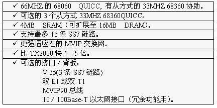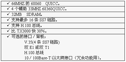TX3000卡的功能大致和TX2000卡相同,但它比TX2000的性能2.5至5倍。TX3000卡上有一個(gè)66MHZ的68060協(xié)處理器。TX3000卡為SS7應(yīng)用配置1至4個(gè)QUICC通信控制器,最多16條信令鏈路,提供一個(gè)三口V.35,擁有雙T1或雙E1接口。(主板上標(biāo)準(zhǔn)配置一個(gè)QUICC,支持四條SS7鏈路,當(dāng)CT總線(xiàn)和串行接口都要使用,或者處理的鏈路超過(guò)4條時(shí),可先配置有三個(gè)QUICC的背板,四個(gè)QUICC可支持16條SS7鏈路)。