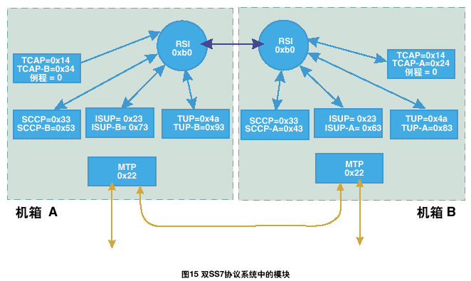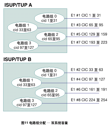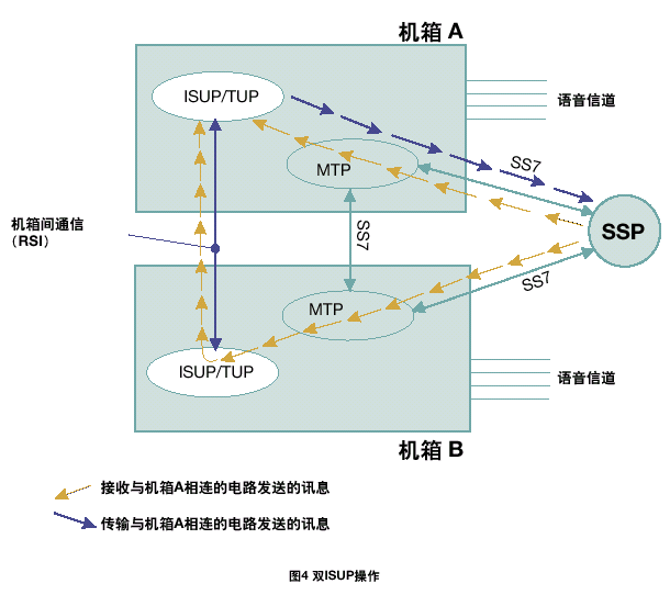 一個(gè)雙ISUP/TUP系統(tǒng)通過(guò)激活每個(gè)機(jī)箱中的一半電路協(xié)議狀態(tài)機(jī)進(jìn)行工作。每個(gè)ISUP/TUP層通過(guò)本地MTP3發(fā)送所有的傳送流量。本地MTP3采用與相鄰SS7節(jié)點(diǎn)之間的本地鏈路進(jìn)行傳輸,如果該鏈路發(fā)生故障,則采用機(jī)箱之間的SS7鏈路。
