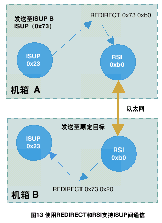 例如,一個(gè)雙ISUP系統(tǒng)應(yīng)該由兩個(gè)ISUP部分組成,每部分缺省module_id都為0x23。A方ISUP的配置數(shù)據(jù)表示另一個(gè)ISUP部分的module_id為0x73;因此,在A方將會(huì)有一個(gè)重定向的動(dòng)作來(lái)對(duì)經(jīng)過(guò)RSI發(fā)送往0x73的任何訊息重新定向。在B方,應(yīng)該有一個(gè)REDIRECT語(yǔ)句將B方RSI所接收的所有目標(biāo)為0x73的訊息路由到本地ISUP,標(biāo)識(shí)為0x23。具體情況如圖13所示。
