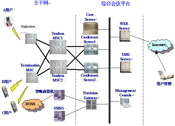 。。系統(tǒng)的信令接續(xù)、呼叫控制、會議控制及語音處理單元。它與MSC以ISUP或TUP信令對接,負責接聽、應(yīng)答來自MSC的來話并建立語音通道,或發(fā)起呼叫至被叫。會議的發(fā)起、橋接、結(jié)束,會議資源的分配等。