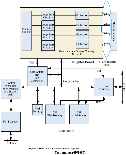 從連接到DMV160LP板卡的16條環(huán)路電話(huà)線(xiàn)上來(lái)的信號(hào)首先要通過(guò)電話(huà)線(xiàn)接口,該接口可以提供對(duì)瞬間電流的保護(hù)以及對(duì)電磁干擾的抑制。這些電話(huà)線(xiàn)接口使用了可靠的晶體開(kāi)關(guān)(沒(méi)有機(jī)械連接)和FCC-Part
