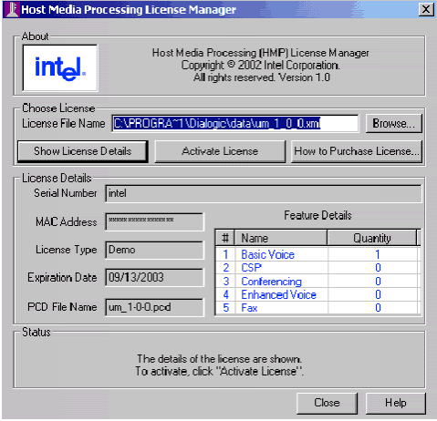 程序> Dialogic NetStructure HMP 1.0 > HMP許可證管理器:參見第4章"主機(jī)媒體處理軟件的許可證程序"。