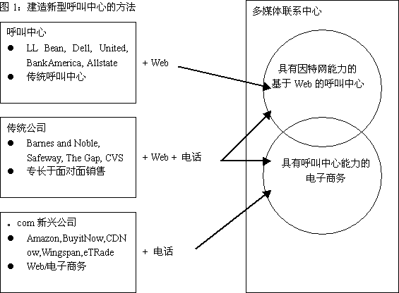 所有的公司都迫切希望找到一種途徑,使自己擁有“具有因特網(wǎng)能力的、web集成的呼叫中心”或“具有呼叫中心能力的電子商務(wù)網(wǎng)站”。圖1所示為實(shí)施方法的一個(gè)實(shí)例。但是,不管你如何稱呼它,如何達(dá)到目標(biāo),你都會面臨處理多媒體聯(lián)系的挑戰(zhàn)。多媒體聯(lián)系中心包括通過電話簽定合同和處理來自web的合同,可能是通過電子郵件,文本交談,電話呼叫,或通過web的語音呼叫。并且,大多數(shù)時(shí)候是由同一組人處理多種媒體服務(wù)。